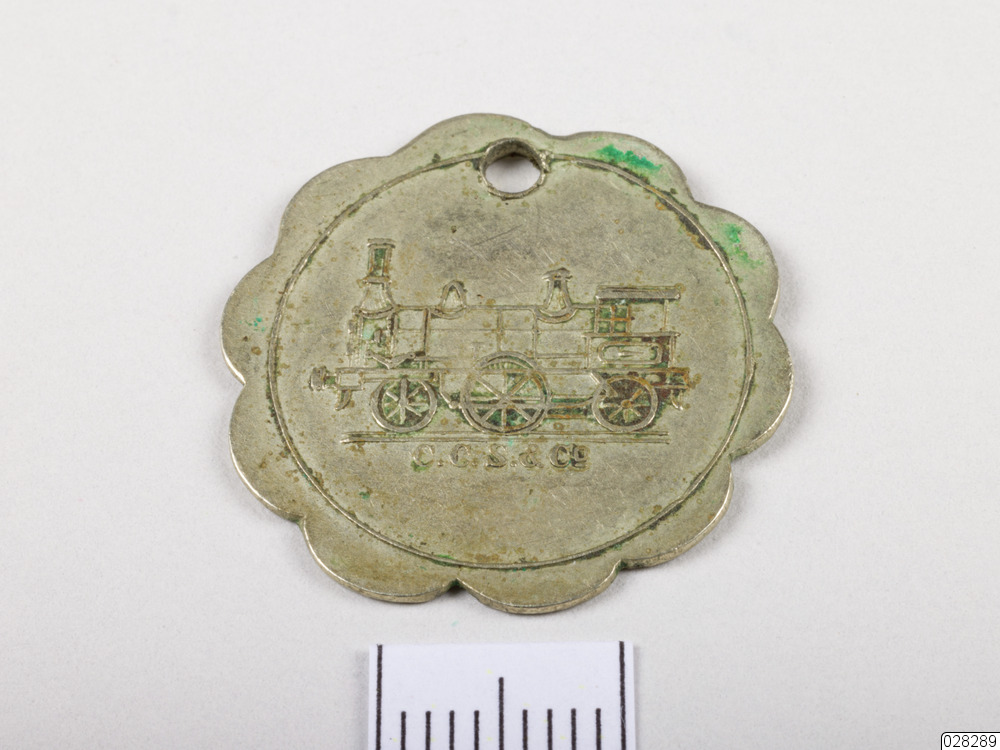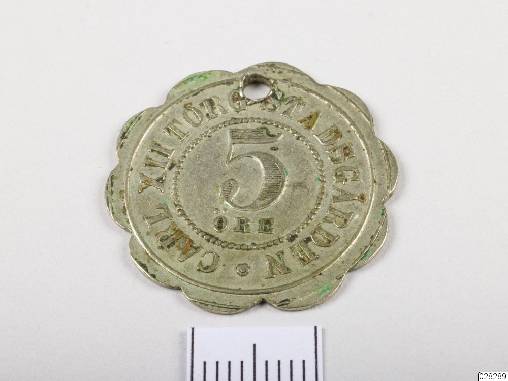- Rund polett med krusig kant. Poletten är försedd med hank. På polettens ena sida står det: "5 ÖRE" i en inre rundel. Runt efter kanten i en yttre ring står det: "CARL XII TORG STADSGÅRDEN". På polettens andra sida finns ett sexhjuligt fordon under vilken står: "C.C.S. &Co".